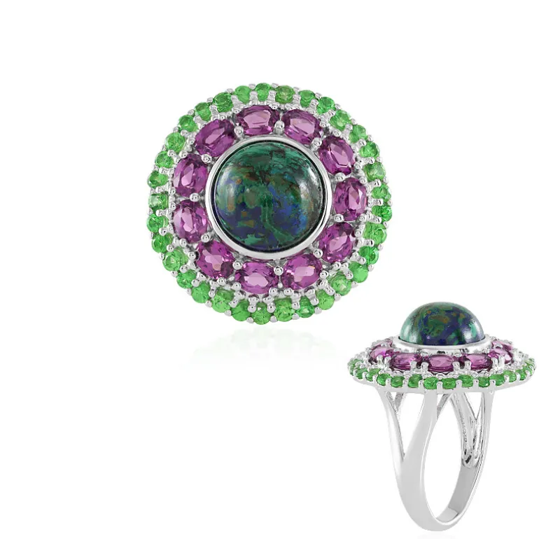 Erleben Sie die vibrierende Anziehungskraft dieses Rings aus Sterlingsilber mit einem faszinierenden 4,779 ct runden Cabochon USA Azurit in seinem Herzen. Das azurblaue Herzstück ist umgeben von 11 üppigen Rhodolithen aus Indien und einer Reihe von 33 atemberaubenden Tsavoriten aus Tansania, die ein herrliches Farbenspiel erzeugen. Der Edelstein mit einem Gesamtgewicht von 7,749 ct ist elegant in hochwertiges 925er Sterlingsilber gefasst und wiegt etwa 5,07 g. Stellen Sie sich vor, wie dieses Schmuckstück Ihren Finger bei einer festlichen Zusammenkunft oder einem gehobenen Abend schmückt.