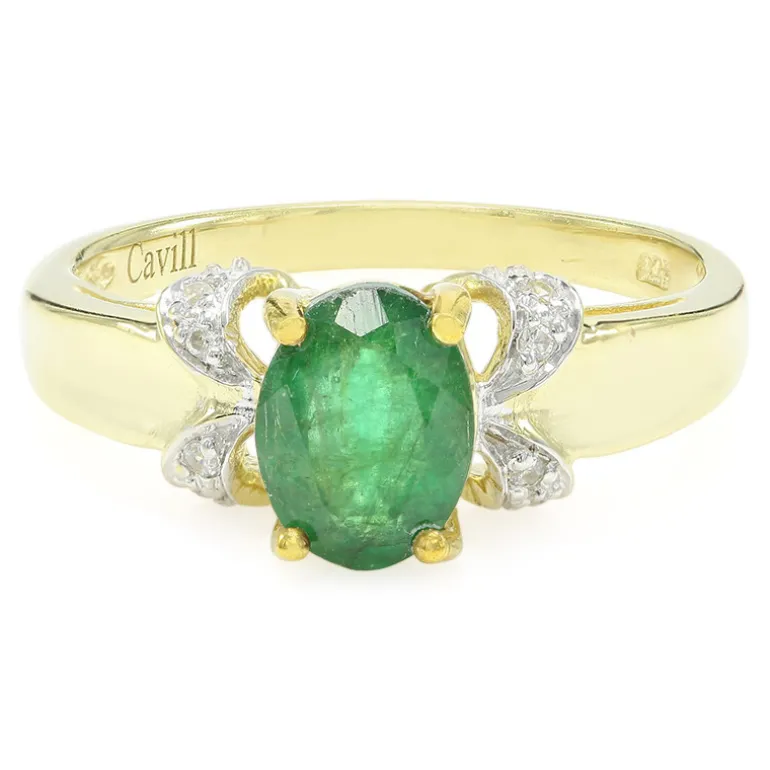 Entdecken Sie die Faszination Brasiliens mit diesem atemberaubenden Ring aus vergoldetem 925er Sterlingsilber, gekrönt von einem glänzenden Bahia-Smaragd im Ovalschliff von 0,99 Karat. Flankiert von funkelnden runden Zirkonen im Brillantschliff von insgesamt 0,063 ct aus Kambodscha, strahlt dieses Schmuckstück Raffinesse aus. Die Kombination aus leuchtenden Grün- und Goldtönen zeugt von einem eleganten Design, das sich sowohl für den Casual Chic als auch für formelle Anlässe eignet. Peppen Sie Ihre Lieblingsoutfits mit dieser exquisiten Ergänzung Ihrer Schmucksammlung auf.