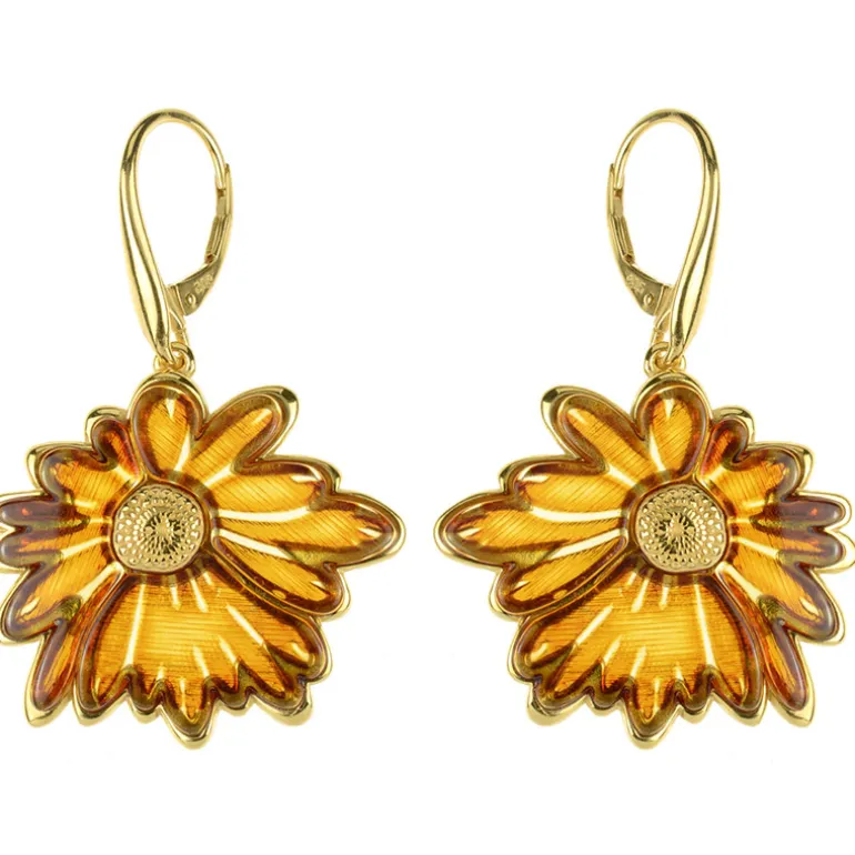 Schmücken Sie Ihre Ohren mit der Wärme von Polens berühmtem baltischem Bernstein. Diese exquisiten Ohrringe aus vergoldetem 925er Sterlingsilber weisen ein Gesamtgewicht von 6,7 Karat auf und sind in einem ausgefallenen Stil geschliffen, der an blühende Blumen erinnert. Mit einer Größe von 43 mm glänzt jedes Stück in einem satten, honiggoldenen Farbton, umrahmt von sorgfältig gearbeiteten Blütenblättern, die durch einen sicheren Hebelverschluss ergänzt werden. Diese Ohrringe sind perfekt geeignet, um sowohl Tages- als auch Abendgarderobe einen Hauch von Eleganz zu verleihen und sind ein Zeugnis der Schönheit der Natur.