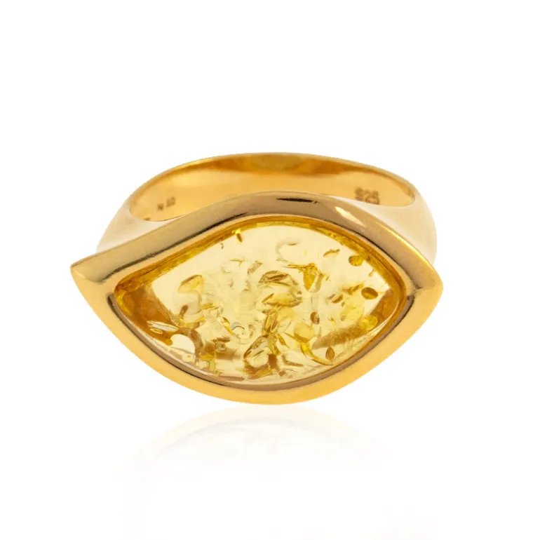 Genießen Sie die Wärme dieses Rings aus vergoldetem 925er Sterlingsilber, der einen polnischen Bernstein mit 1,75 Karat Fancy-Cabochon präsentiert. Sein satter, honigfarbener Farbton und seine natürlichen Einschlüsse machen jedes Stück einzigartig – wie ein Tropfen Sonnenlicht, der Ihre Hand ziert. Mit einer Größe von 22×19 mm und einer bequemen Passform ist er ein verführerisches Accessoire, das sich perfekt eignet, um Ihrer Alltagskleidung einen Hauch von Eleganz zu verleihen oder ein Ensemble für einen besonderen Anlass aufzuwerten.