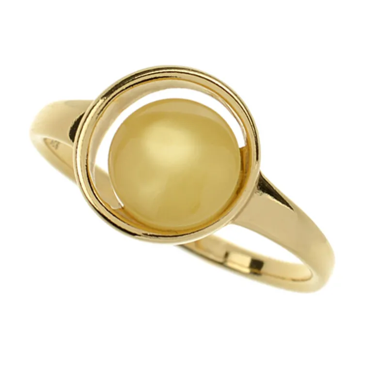 Dieser Ring aus vergoldetem 925er Sterlingsilber ist ein Schatz aus der Ostsee. Er präsentiert einen runden Cabochon von 0,745 Karat aus warmem, honigfarbenem polnischem baltischem Bernstein. Mit einem Gewicht von ca. 2,35 g unterstreicht die glänzende Oberfläche des Rings die natürliche Schönheit des Bernsteins und macht ihn perfekt, um jedem Outfit einen Hauch von Eleganz zu verleihen. Er ist ideal für besondere Anlässe oder das tägliche Tragen und verleiht Ihrem Ensemble einen subtilen Glanz.
