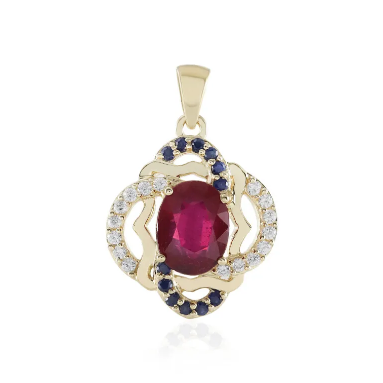Dieser bezaubernde Anhänger besteht aus einem 2,086-karätigen Bemainty-Rubin aus Madagaskar im perfekten Ovalschliff, gefasst in 9-karätigem Gelbgold. Der Rubin ist von 12 blauen Saphiren im Rundschliff und 16 funkelnden Zirkonen aus Kambodscha mit einem Gesamtgewicht von 0,445 ct umgeben, die einen atemberaubenden Kontrast bilden und den satten Farbton des Rubins noch verstärken. Dieser exquisit gestaltete Anhänger misst 24 x 16 mm und verkörpert Raffinesse. Tragen Sie ihn zu einem klassischen Kleid mit V-Ausschnitt für einen Hauch von Glamour, oder werten Sie Ihr Freizeitoutfit mit seiner zeitlosen Eleganz auf.