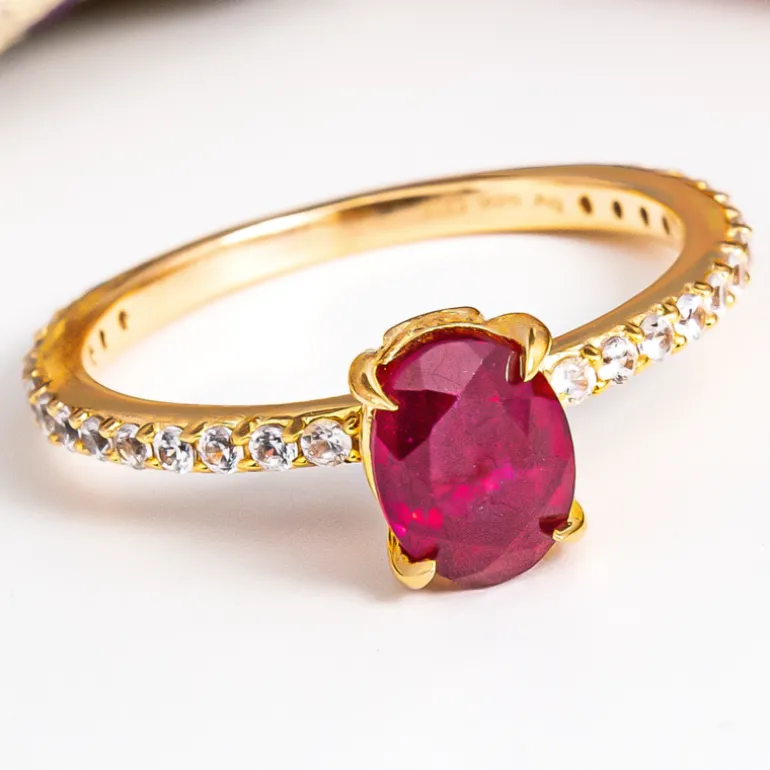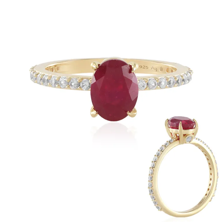 Entdecken Sie die Anziehungskraft dieses Rings aus Madagaskar Bemainty Ruby mit einem 1,62-karätigen Mittelstück in luxuriösem, vergoldetem 925er Sterling Silber. Verziert mit kambodschanischen Zirkon-Akzenten von insgesamt 0,636ct, strahlt dieses Stück mit einem oval geschliffenen Rubin, der von glitzerndem Zirkon-Pavé entlang des Bandes flankiert wird. Dieser Ring eignet sich perfekt, um Ihrem Ensemble einen Hauch von Leidenschaft zu verleihen. Tragen Sie ihn zu einem romantischen Abend oder einer eleganten Veranstaltung, um Ihren Stil zu unterstreichen.