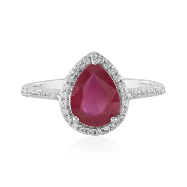 Entdecken Sie die Faszination dieses bezaubernden Rings aus 925er Sterlingsilber mit einem atemberaubenden tropfenförmigen Bemainty-Rubin aus Madagaskar, der von einem Kranz aus 41 kambodschanischen Zirkonen akzentuiert wird. Der tropfenförmige Rubin mit einem Gewicht von 1,918 Karat ist exquisit geschliffen, um seine tiefe, lebendige Farbe hervorzuheben, und wird durch das Funkeln der Zirkone im Rundschliff von insgesamt 0,249 Karat ergänzt. Sein zeitloses Design und die glänzende Rhodinierung machen ihn zu einer exquisiten Ergänzung für jede Sammlung. Perfekt für Abendveranstaltungen oder um Ihrem Alltagslook einen Hauch von Eleganz zu verleihen.