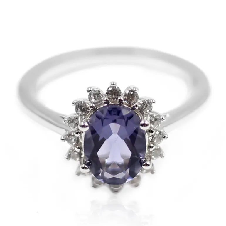 Entdecken Sie die Faszination dieses atemberaubenden Blaubeerquarz-Rings. Der aus Brasilien stammende zentrale Edelstein ist ein ovaler Quarz mit einem Gewicht von 0,997 Karat, der von einem funkelnden Ring aus 16 kambodschanischen Zirkonen im Rundschliff mit insgesamt 0,323 Karat umgeben ist. Der aus 925er Sterlingsilber gefertigte Ring hat ein Gesamtkaratgewicht von 1,32 ct. Der tiefe violette Farbton des Quarzes wird durch den Glanz des Silbers wunderbar ergänzt. Dieser Ring mit den Maßen 23×20 mm ist ein vielseitiges Schmuckstück, das sowohl zur Freizeit- als auch zur Abendgarderobe passt.
