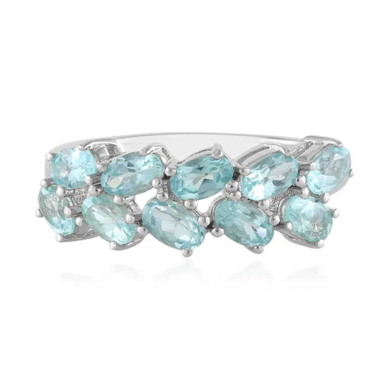 Dieser bezaubernde Ring enthält zehn blaue Apatite im Ovalschliff aus Brasilien mit insgesamt 2,279 Karat. Er ist aus platiniertem 925er Sterlingsilber gefertigt, hat eine glänzende Oberfläche und ein Gewicht von 3,13 g. Das strahlende Design passt sowohl zu legeren als auch zu eleganten Anlässen und ergänzt jedes Outfit, vom eleganten Abendkleid bis zum stilvollen Tagesoutfit.