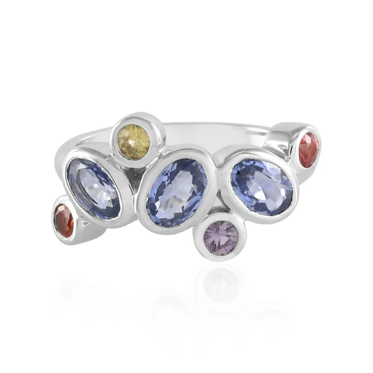 Entdecken Sie die Anziehungskraft dieses Rings aus Sterlingsilber mit einem fesselnden Cluster aus erstklassigen Ceylon-Saphiren aus Sri Lanka mit einem Gewicht von 1,558 ct und einem Quartett aus Madagaskar-Saphiren mit insgesamt 0,391 ct. Der Ring präsentiert eine exquisite Reihe von Saphiren im Oval- und Rundschliff, die mit feinem 925er Sterlingsilber überzogen sind. Das moderne Schmuckstück funkelt in tiefblauen Tönen, die von den zarten Pastellfarben der umliegenden Edelsteine akzentuiert werden und sowohl zu formellen als auch zu legeren Ensembles passen. Erleben Sie die dauerhafte Schönheit von Saphiren mit diesem eleganten Accessoire.