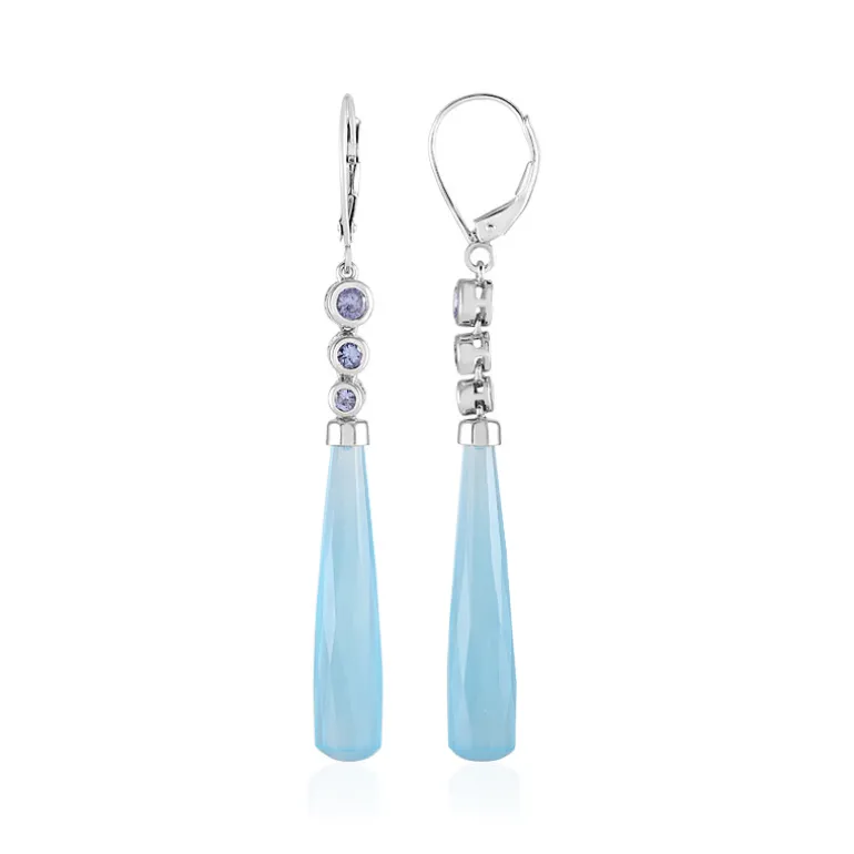 Diese eleganten und raffinierten Ohrringe bestehen aus langgestreckten indisch-blauen Chalcedonen im Phantasieschliff mit einem Gesamtgewicht von 17,46 ct, die elegant an einer Reihe von abgestuften Tansaniten im Rundschliff mit einem Gewicht von 0,54 ct hängen. Die 63 mm großen Tropfen aus 9-karätigem Gold bilden eine ruhige Kaskade aus kühlen Blautönen, die an einen klaren Himmel erinnern. KM by Juwelo ist perfekt geeignet, um sowohl Tages- als auch Abendgarderobe einen Hauch von Anmut zu verleihen und sorgt mit diesen bezaubernden Accessoires für ein raffiniertes Finish.