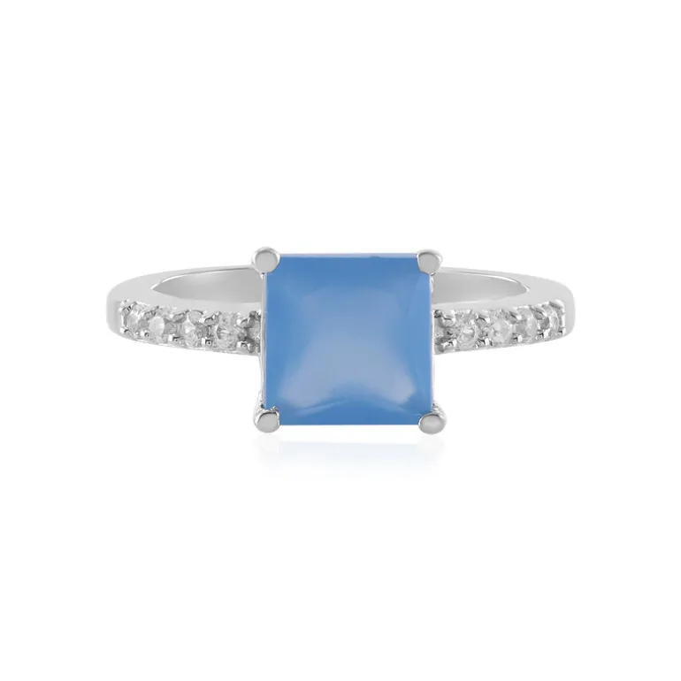 Ein Ring, der Eleganz und Lebendigkeit vereint: ein blauer Chalzedon im Prinzessinnenschliff aus Indien, eingefasst in glänzendes, platiniertes Sterlingsilber. Acht funkelnde Zirkone verleihen diesem Ring einen ganz besonderen Reiz. Dieses Schmuckstück eignet sich perfekt für besondere Anlässe oder als Farbtupfer im Alltag und passt sowohl zu eleganten als auch zu formellen Outfits.