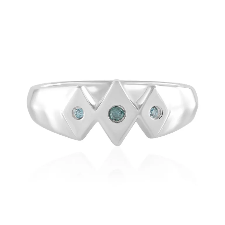 Dieser auffällige Ring aus Sterlingsilber enthält drei atemberaubende blaue I2-Diamanten mit einem Gesamtgewicht von 0,044 ct im Brillantschliff. Das moderne Design hebt die leuchtenden Edelsteine hervor und bietet einen 2 mm großen zentralen Diamanten, der von zwei 1,3 mm großen Seitensteinen ergänzt wird. Perfekt, um jedem Outfit einen Hauch von Eleganz zu verleihen, sei es für einen lässigen Tagesausflug oder eine raffinierte Abendveranstaltung.