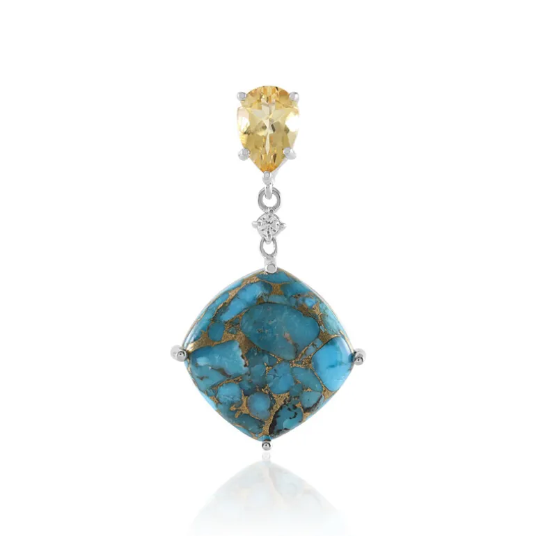 Entdecken Sie den verführerischen Charme unseres Mohave-Türkis & Citrin Silberanhängers. Er besteht aus einem leuchtenden blauen Mohave-Türkis im Kissenschliff (15,156 Karat) aus den USA, der von einem brasilianischen Citrin in Birnenform (1,588 Karat) und einem brasilianischen weißen Topas mit einem Hauch von Brillanz elegant akzentuiert wird. Eingefasst in platiniertes 925er Sterling Silber ist dieser Anhänger ein wahrer Schatz an Schönheit und Anmut. Die antike, kissenförmige Silhouette in Kombination mit den glänzenden Edelmetallen macht ihn zu einem Statement-Stück, das sich sowohl für zwanglose Brunches als auch für formelle Abende eignet.