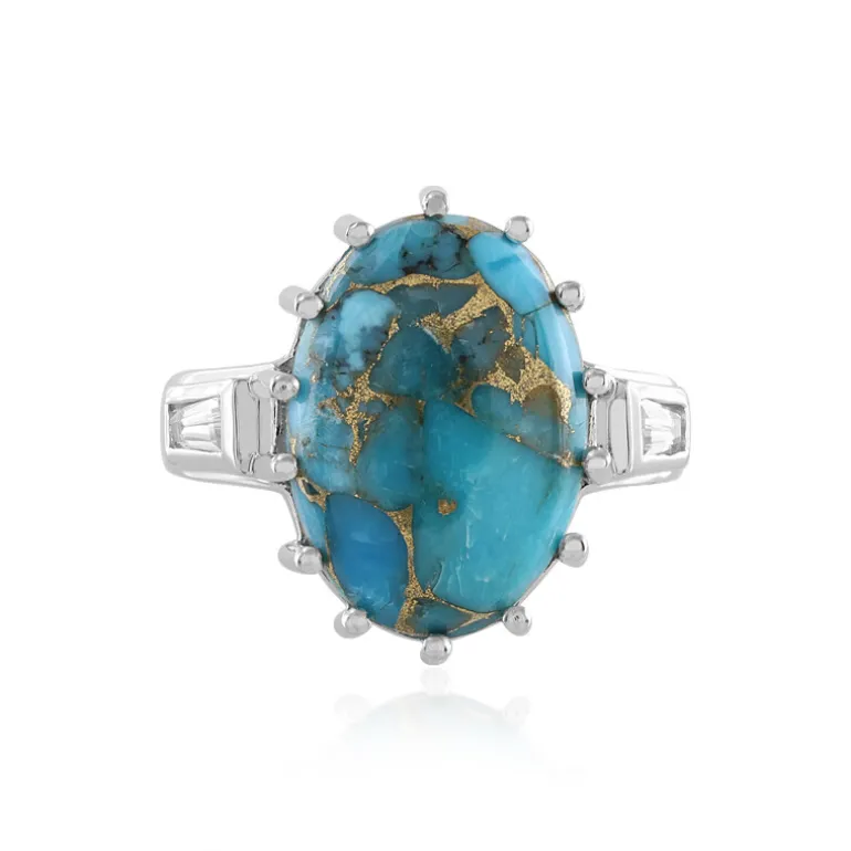 Entdecken Sie die Faszination des amerikanischen Südwestens mit diesem raffinierten Ring aus blauem Mohave-Türkis. Mit einem atemberaubenden ovalen Cabochon von 9,064 Karat, gefasst in platiniertem 925er Sterlingsilber, ist dieses Schmuckstück ein wahres Zeugnis handwerklicher Kunstfertigkeit. Akzentuiert mit zwei weißen Topasen im Phantasieschliff aus Brasilien von insgesamt 0,256 Karat, wird er zu einer schimmernden Leinwand der Eleganz. Mit seinen Maßen von 25 x 21 mm ist dieser Ring perfekt geeignet, um einen Hauch von leuchtendem Blau in Ihr tägliches Outfit zu bringen oder ein schickes Ensemble für besondere Anlässe zu akzentuieren.