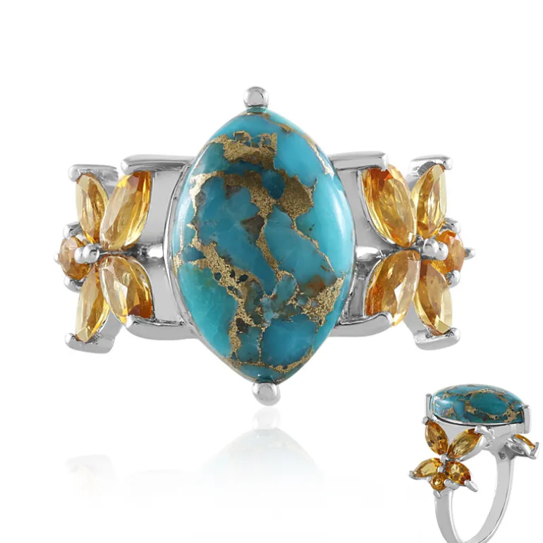 Entdecken Sie die lebendige Anziehungskraft dieses Mohave-Türkisrings mit einem markanten 4,051-karätigen Marquise-Cabochon. Die Steine werden von strahlenden Zitrinen aus Brasilien akzentuiert und sind in glattem, platiniertem Sterlingsilber gefasst. Dieses Schmuckstück verbindet mühelos kräftige Farben mit Eleganz und ist perfekt, um jedem Ensemble einen Hauch von Raffinesse zu verleihen. Er eignet sich sowohl für den täglichen Gebrauch als auch für besondere Anlässe und lässt sich hervorragend mit erdfarbenen Outfits kombinieren.
