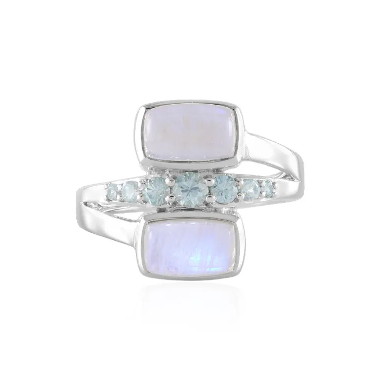 Wir präsentieren einen atemberaubenden Ring aus blauem Mondstein aus Sterlingsilber von KM für Juwelo. Dieses Stück zeigt zwei faszinierende blaue Mondsteine aus Indien, ergänzt durch Ratanakiri-Zirkone aus Kambodscha. Mit einem Gesamtgewicht von 3,789 ct bietet er ein fesselndes Strahlen. Er eignet sich perfekt, um der Abendgarderobe einen eleganten Touch zu verleihen oder bei einer besonderen Veranstaltung ein Statement abzugeben. Kombinieren Sie ihn mit silbernen Accessoires für einen koordinierten Look.