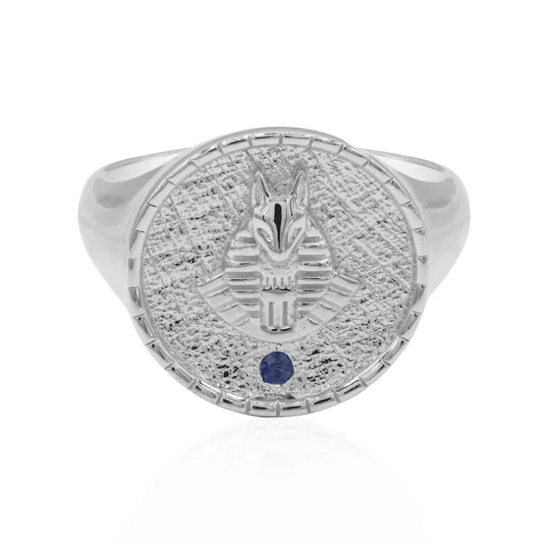 Dieser auffällige Ring präsentiert einen blauen Saphir im Rundschliff aus Sri Lanka, gefasst in hochwertigem 925er Sterlingsilber. Das kühne Design verfügt über ein einzigartiges Emblem, das diesem ohnehin schon beeindruckenden Schmuckstück einen Hauch von Unterscheidungskraft verleiht. Mit einem Gesamtgewicht von 0,04 Karat passt er sowohl zu eleganten als auch zu formellen Anlässen. Ideal für alle, die subtile Eleganz mit einem Hauch von Geheimnis zu schätzen wissen, ist er eine zeitlose Ergänzung für jede Sammlung.