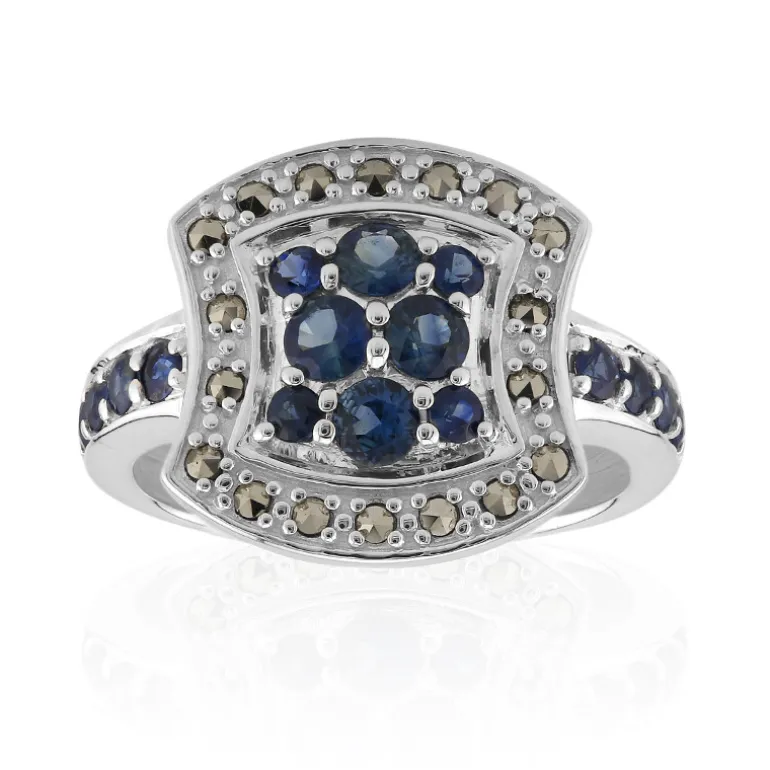 Dieser atemberaubende Ring besteht aus einer Reihe tiefblauer Saphire aus Madagaskar, die von einem Heiligenschein aus funkelnden Markasiten aus Rumänien akzentuiert werden. Gefertigt aus glänzendem 925er Sterlingsilber und mit einem Gesamtkaratgewicht von 0,94 ct ist dieses Schmuckstück ein Zeugnis klassischer Eleganz mit einem modernen Twist. Das filigrane Design und der satte, königsblaue Farbton machen ihn zu einem vielseitigen Accessoire, das sich sowohl für zwanglose Ausflüge als auch für formelle Anlässe eignet. Lassen Sie diesen Ring das Herzstück Ihres Ensembles sein und Komplimente und Bewunderung auf sich ziehen.