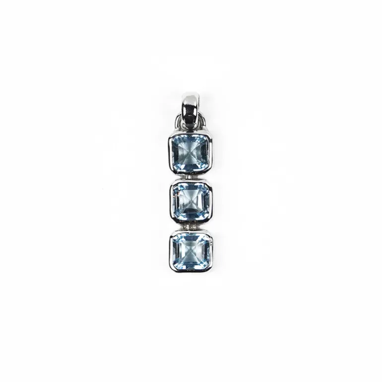 Mit einem Trio aus faszinierenden indischen Blautopasen, von denen jeder meisterhaft in eine elegante Achteckform geschliffen wurde, strahlt dieser Anhänger Raffinesse aus. Die Fassung aus 925er Sterlingsilber mit einem Gewicht von etwa 2,6 Gramm spiegelt die kühlen Farbtöne der Edelsteine wider. Das vertikale Design macht den Anhänger zu einem vielseitigen Accessoire, das sowohl zu legerer als auch zu formeller Kleidung einen Hauch von Farbe verleiht. Ideal für Liebhaber des modernen Stils und der zeitlosen Eleganz.