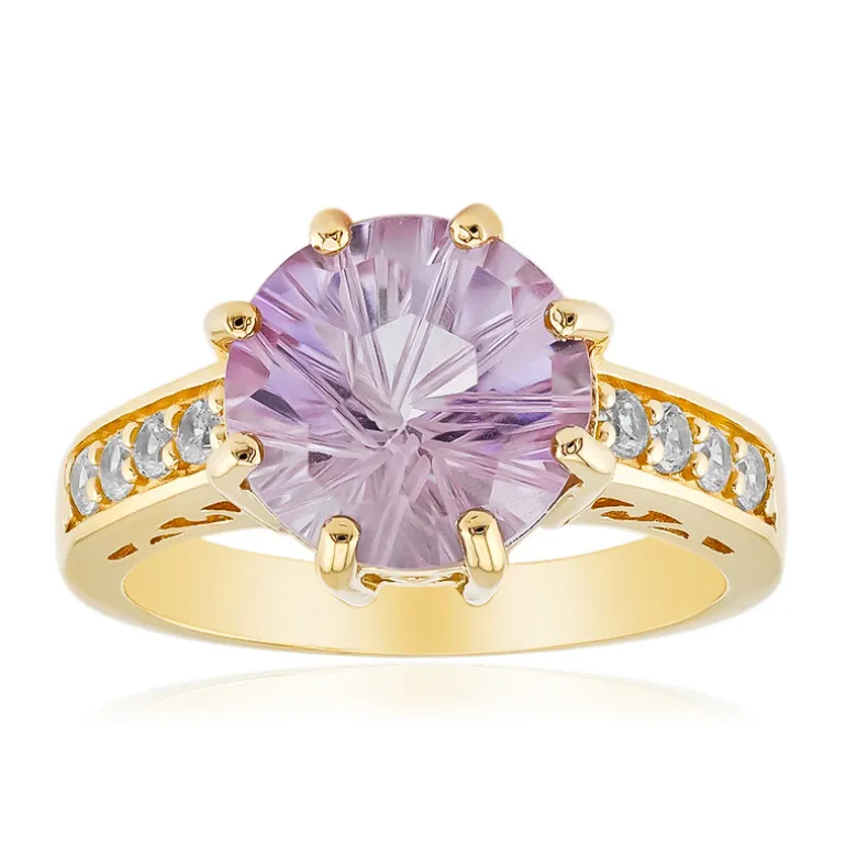 Entdecken Sie die Eleganz dieses atemberaubenden Rings mit einem 3,105 Karat schweren bolivianischen Amethysten im Fancy-Rundschliff, der durch tansanische Zirkon-Akzente wunderbar ergänzt wird. Gefertigt aus 925er Sterlingsilber mit luxuriöser Goldplattierung. Perfekt für einen Abend oder um Ihrem täglichen Outfit einen Hauch von Eleganz zu verleihen. Kombinieren Sie sie mit einem klassischen schwarzen Kleid für einen kompletten Look.