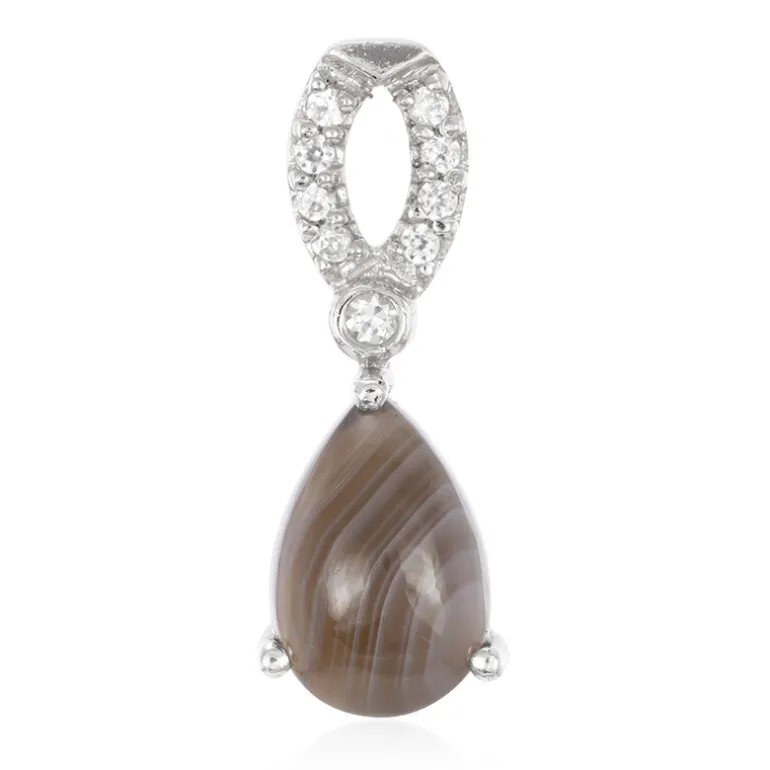Verleihen Sie Ihrem Ensemble einen Hauch von naturinspirierter Eleganz mit diesem bezaubernden Achat-Anhänger aus Botswana. Der 2,46 Karat schwere Edelstein hat einen polierten, tropfenförmigen Cabochon-Schliff, der die einzigartigen Streifen und erdigen Farbtöne des Steins zur Geltung bringt. Umgeben von funkelnden kambodschanischen Zirkon-Akzenten mit einem Gesamtgewicht von 0,195 Karat ist dieser Anhänger ein echter Hingucker. Der Anhänger ist aus glänzendem 925er Sterlingsilber gefertigt und verbindet Langlebigkeit mit einer filigranen Ästhetik – perfekt für den täglichen Gebrauch oder besondere Anlässe. Lassen Sie diesen Anhänger zum Gesprächsanlass bei Ihrem nächsten Treffen werden oder zu einem aufmerksamen Geschenk für jemand Besonderen.