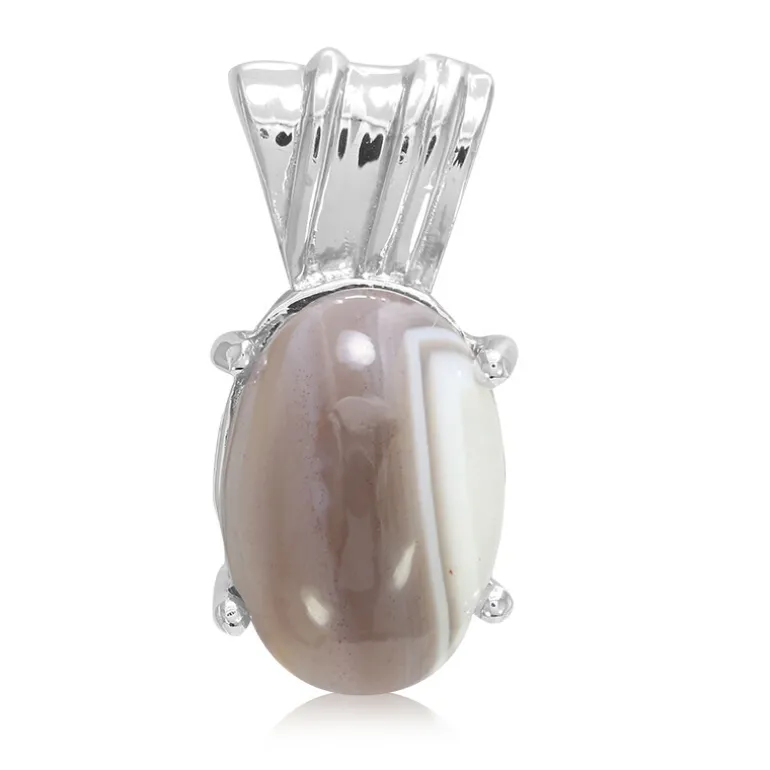 Genießen Sie die natürliche Schönheit dieses Achat-Anhängers aus Botswana mit einem ovalen Cabochon-Edelstein von 4,05 Karat, der eine erdige Eleganz ausstrahlt. Der Anhänger ist aus glattem 925er Sterlingsilber gefertigt und hebt die einzigartigen, in Silber eingefassten Streifenmuster des Achats hervor, die jedes Ensemble aufwerten. Er ist ideal, um Ihrer Freizeitkleidung einen Hauch von Raffinesse zu verleihen oder Ihre Abendgarderobe aufzuwerten, denn er ist ein vielseitiges Schmuckstück für verschiedene Anlässe.