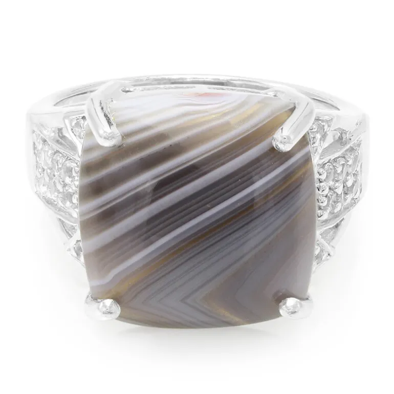 Tauchen Sie ein in die verführerischen Schichten dieses Achatrings aus Botswana, gekrönt von einem antiken Kissen-Cabochon von 7,62 Karat, der durch seine einzigartige Bänderung besticht. Eingebettet in 925er Sterlingsilber, wird das Herzstück von funkelnden weißen Topasen aus Brasilien mit einem Gesamtgewicht von 0,233 ct flankiert, die ihm einen Hauch von Brillanz verleihen. Das 3,78 g schwere Silberband ist mit raffinierten Details versehen, die diesen Ring zu einem Schatz für jede Sammlung machen. Egal, ob Sie sich nach oben oder nach unten kleiden, er ist eine vielseitige Ergänzung Ihres Ensembles.