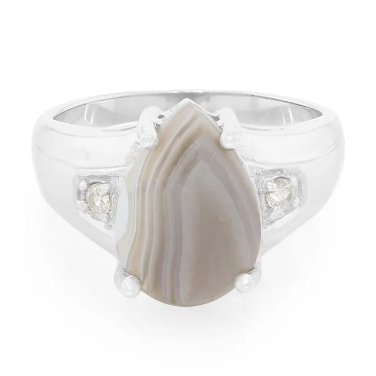 Entdecken Sie die Anziehungskraft dieses tropfenförmigen Achats aus Botswana, der elegant in ein Band aus 925er Sterlingsilber gefasst ist. Mit einem Gewicht von 3,56 ct strahlt dieser Edelstein eine weiche, erdige Farbpalette aus, die durch zwei funkelnde kambodschanische Zirkon-Akzente von insgesamt 0,158 ct ergänzt wird. Der Ring mit einer Größe von 32,5 x 24 mm bietet eine harmonische Mischung aus von der Natur inspirierter Schönheit und raffinierter Handwerkskunst. Perfekt, um Ihrem Alltag einen Hauch von Raffinesse zu verleihen oder für besondere Anlässe, die nach einem einzigartigen, stilvollen Accessoire verlangen.