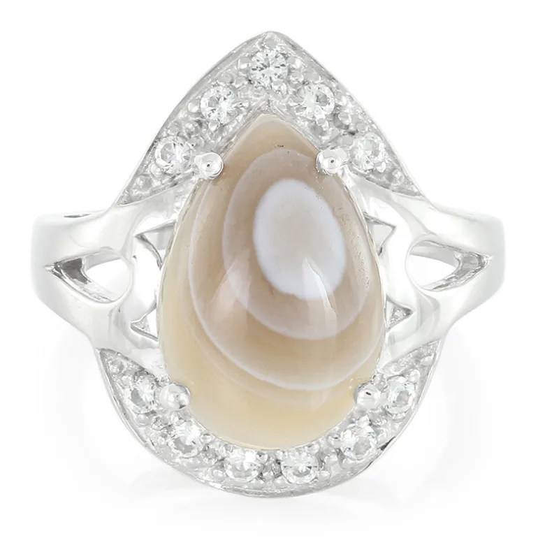 Entdecken Sie die ruhige Schönheit dieses bezaubernden Rings aus Botswana-Achat, der von einem Halo aus funkelndem brasilianischem Weißtopas akzentuiert wird. Der einzigartige 3,64 Karat große Cabochon in der Mitte des Rings ist elegant in hochwertiges 925er Sterlingsilber gefasst und bringt die natürlichen Erdtöne zur Geltung, die diesen Edelstein so beliebt machen. Die subtile Farbpalette macht ihn zu einem idealen Accessoire sowohl für die Freizeit als auch für anspruchsvolle Anlässe. Kombinieren Sie dieses Schmuckstück mit cremefarbenen oder erdfarbenen Kleidungsstücken, um seinen natürlichen Charme zu unterstreichen.