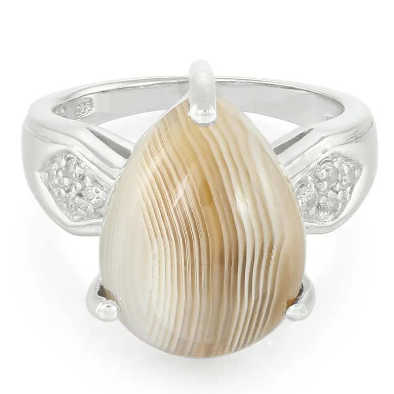 Erleben Sie die natürliche Anziehungskraft dieses Achatrings aus Botswana mit einem tropfenförmigen Cabochon in der Mitte, der die Essenz der afrikanischen Landschaft einfängt. Der Achat von 5,56 ct. wird elegant von 0,138 ct. funkelnden runden weißen Topasen aus Brasilien akzentuiert. Gefertigt aus 925er Sterlingsilber mit einem Gesamtgewicht von 4,23 g strahlt dieses Schmuckstück einen raffinierten Charme aus. Es eignet sich sowohl für legere Ensembles als auch für die Abendgarderobe und verspricht, eine vielseitige Ergänzung für jede Schmucksammlung zu sein.