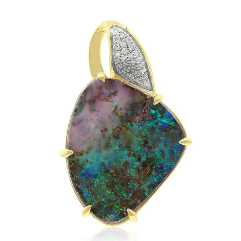 Entdecken Sie die natürliche Pracht dieses Anhängers aus 18 Karat Gold mit einem faszinierenden australischen Boulder-Opal im Fancy-Schliff von 11,356 Karat. Sein schillerndes Farbenspiel wird durch 26 zarte SI2 (H) Diamanten von insgesamt 0,111 Karat akzentuiert. Der Anhänger mit den Maßen 33×22 mm und einem Gewicht von 6,65 g aus reinem Gold ist für Liebhaber von einzigartigem Luxus bestimmt. Er eignet sich perfekt für Galaveranstaltungen oder als besonderes Schmuckstück und ergänzt jede elegante Kleidung mit einem Hauch von Farbe und Raffinesse.