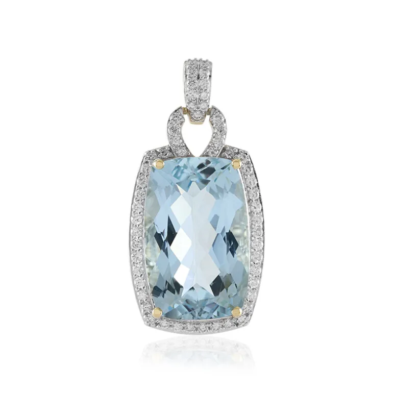 Entdecken Sie zeitlose Eleganz mit diesem atemberaubenden brasilianischen Aquamarin-Anhänger aus glänzendem 14 Karat Gelbgold. Mit einem fesselnden 9,639 Karat Aquamarin im Antik-Schliff, der von Brillanten flankiert wird, wertet dieses Schmuckstück jedes Outfit mühelos auf. Er eignet sich sowohl für den Alltag als auch für besondere Anlässe und passt hervorragend zu Abendkleidern oder formellen Anzügen, die Ihrem Ensemble einen Hauch von Raffinesse verleihen.