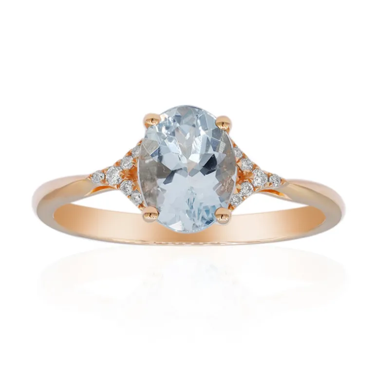 Treten Sie mit diesem exquisiten brasilianischen Aquamarinring in eine Welt der heiteren Eleganz ein. Ein prächtiger Aquamarin im Ovalschliff mit einem Gewicht von 1,19 Karat schwebt in einer anmutigen Fassung aus 10-karätigem Roségold, akzentuiert von einer Konstellation funkelnder SI1-Diamanten von insgesamt 0,05 Karat. Die sanften Farbtöne des Roségoldes ergänzen das kühle Blau des Mittelstücks und schaffen so ein harmonisches Gleichgewicht, das sowohl für die Anmut des Tages als auch für den Glamour des Abends geeignet ist. Mit einem Gesamtkaratgewicht von 1,24 Karat ist dieser Ring ein subtiles und doch atemberaubendes Schmuckstück, das in jeder Schmucksammlung einen Ehrenplatz einnehmen wird.