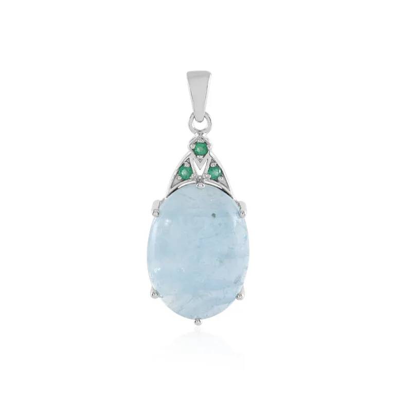 Mit diesem faszinierenden brasilianischen Aquamarin-Anhänger können Sie die ruhige Schönheit des Ozeans genießen. Der ovale Aquamarin mit einem Gewicht von 12,933 Karat wird von drei schimmernden russischen Smaragden mit einem Gesamtgewicht von 0,125 Karat unterstrichen. Eingefasst in glänzendes, platiniertes 925er Sterlingsilber wiegt dieses verführerische Schmuckstück ca. 3,24 g. Mit seinen Maßen von 36 x 15 mm strahlt es Raffinesse aus und ist damit ein ideales Accessoire für den Tag und den Abend. Kombinieren Sie es mit einem fließenden Kleid oder einer klassischen Bluse, um Ihrem Outfit einen Hauch von anmutiger Finesse zu verleihen.