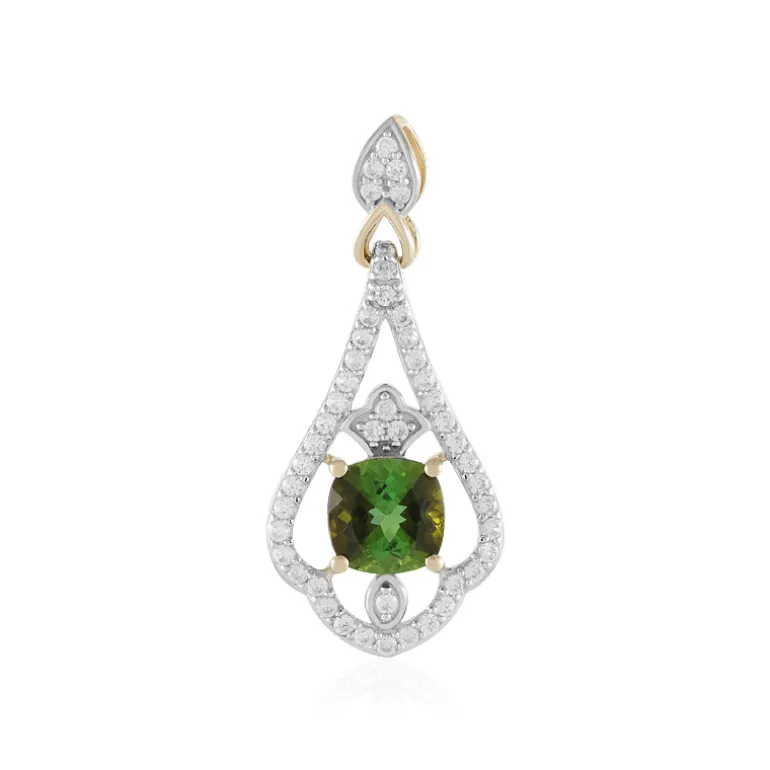 Entdecken Sie zeitlose Eleganz mit diesem grünen Turmalin-Goldanhänger. Der brasilianische Turmalin von 1,305 Karat im antiken Kissenschliff wird durch funkelnde Zirkone aus Kambodscha ergänzt. Perfekt, um der Abendgarderobe einen Hauch von Raffinesse zu verleihen oder die Alltagskleidung aufzuwerten. Das filigrane Design und die hochwertigen Materialien machen ihn zu einem idealen Geschenk für besondere Anlässe.