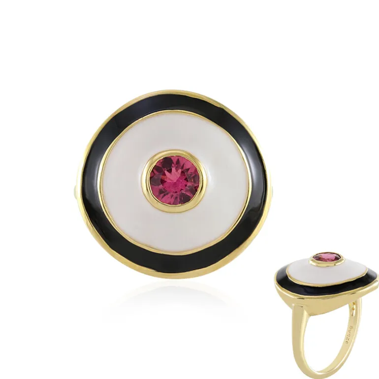 Entdecken Sie die Faszination dieses einzigartigen Rings mit einem brasilianischen rosa Turmalin von 0,414 Karat im Rundschliff, gefasst in wunderschön verarbeitetem, vergoldetem 925er Sterling Silber. Der fesselnde Kontrast zwischen dem leuchtenden rosa Edelstein und dem glänzenden Hintergrund macht diesen Ring zu einem außergewöhnlichen Accessoire. Sein modernes Design mit einer auffälligen Größe von 23×20 mm ist perfekt für alle, die ihrem Ensemble einen Hauch von Raffinesse verleihen möchten. Dieser Ring ist nicht nur ein Schmuckstück, sondern auch ein Gesprächsanlass, der sich sowohl für lässige Brunchs als auch für exquisite Abendveranstaltungen eignet.