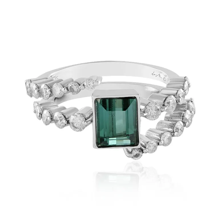 Dieser raffinierte Ring präsentiert einen faszinierenden brasilianischen Turmalin von 1,406 Karat, der in einem schlanken Baguette geschliffen ist. Um den zentralen Edelstein herum sind 18 Diamanten mit einer Reinheit von SI1 von insgesamt 1,031 Karat angeordnet, die einen schillernden Kontrast bilden. Das aus ca. 5,84 g 14-karätigem Weißgold gefertigte Stück strahlt mit seinem modernen Design Eleganz aus. Perfekt, um Ihrer Abendgarderobe einen Hauch von Luxus zu verleihen oder Ihren alltäglichen Stil aufzuwerten, ist es ein atemberaubendes Statement von Schönheit und Anmut.