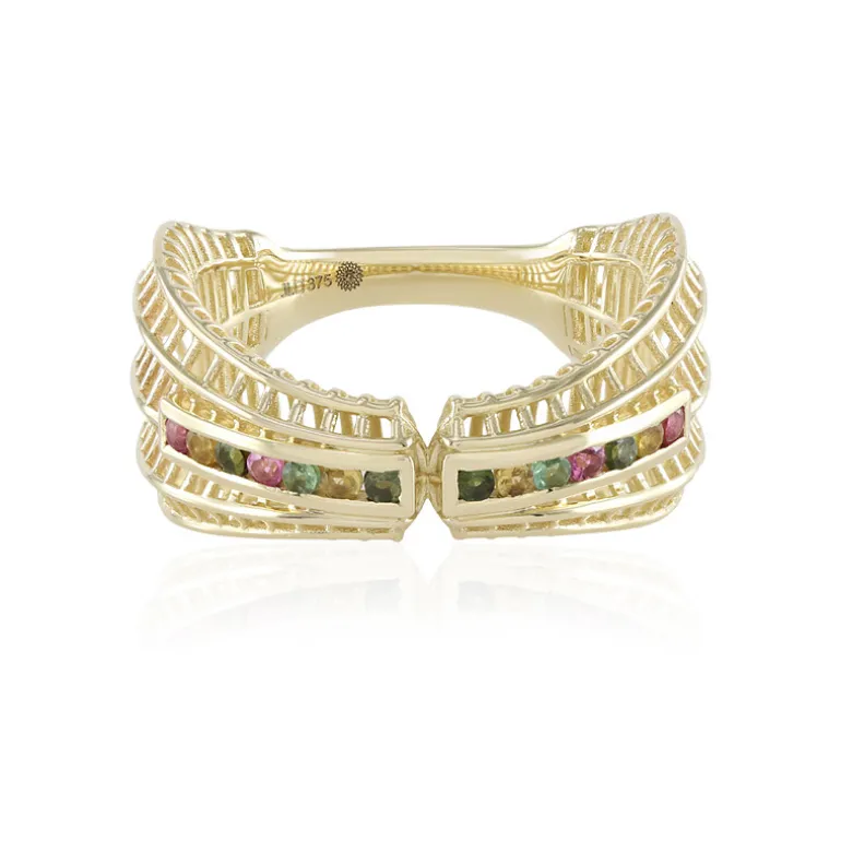 Entdecken Sie die Symphonie der Farben mit diesem leuchtenden Ring aus 9 Karat Gelbgold, der mit einer Reihe brasilianischer Edelsteine verziert ist. Jeder Stein ist meisterhaft geschliffen, um das Licht einzufangen und seine Schönheit zu präsentieren. Mit gelben, rosafarbenen und grünen Turmalinen, die von Indigolithen unterstrichen werden, verkörpert dieses verschnörkelte 0,227-Kilo-Design Raffinesse und Eleganz. Er eignet sich perfekt, um neutralen Outfits einen Farbtupfer zu verleihen oder ein farblich abgestimmtes Ensemble zu vervollständigen, und ist die ideale Wahl sowohl für zwanglose Brunchs als auch für Abendveranstaltungen. Lassen Sie den farbenfrohen Charme dieses sorgfältig gefertigten Stücks von Ornaments by de Melo zu einem festen Bestandteil Ihrer Schmucksammlung werden.
