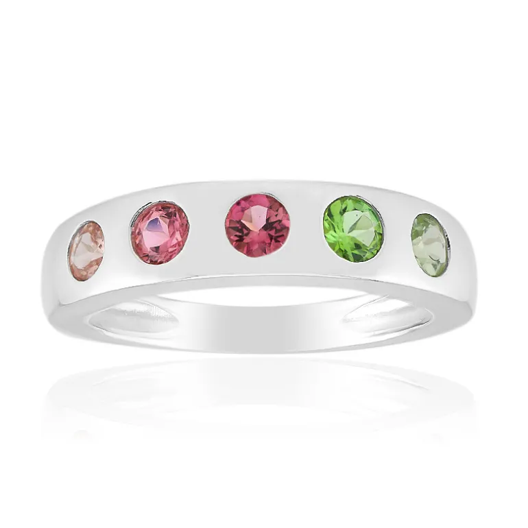 Erleben Sie die lebendige Anziehungskraft dieses brasilianischen Turmalin-Sterlingsilberrings, der fünf Turmaline im Rundschliff mit einem Gesamtgewicht von 0,425 Karat enthält. Die farbenfrohen Edelsteine sind in glänzendes 925er Sterlingsilber gefasst und bieten eine reizvolle Mischung aus Eleganz und Stil. Dieser Ring eignet sich perfekt, um jedem Outfit einen Hauch von Farbe zu verleihen, und ist sowohl für legere als auch für formelle Anlässe geeignet.