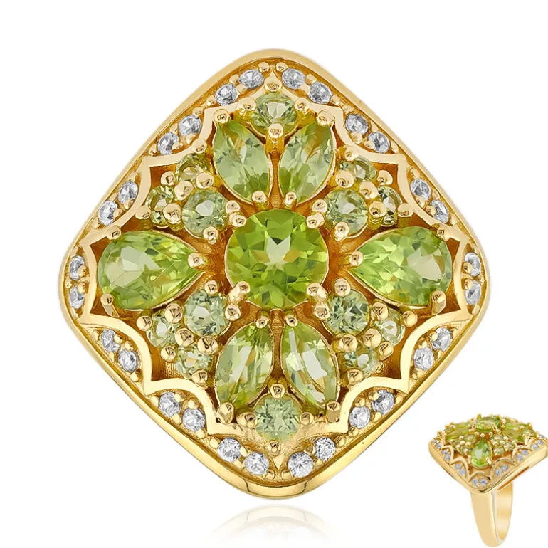 Dieser exquisite Ring präsentiert eine atemberaubende Reihe burmesischer Peridots von insgesamt 2,816 Karat, gefasst in strahlend vergoldetem 925er Sterlingsilber. Sein kompliziertes Design weist Birnen-, Rund- und Marquise-Schliffe auf, die von schillernden Zirkonen aus Tansania akzentuiert werden. Dieser Ring eignet sich perfekt für besondere Anlässe und verleiht sowohl der Abendgarderobe als auch raffinierter Tageskleidung einen Hauch von Eleganz, der Licht und Bewunderung gleichermaßen einfängt.