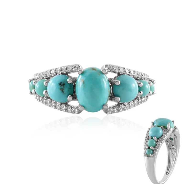 Dieser atemberaubende Ring zeigt die lebendige Schönheit des Campitos-Türkises, ergänzt durch funkelnde Zirkone aus Tansania. Er ist aus hochwertigem 925er Sterlingsilber mit einer glamourösen Platinbeschichtung gefertigt und wiegt etwa 2,37 g. Das Schmuckstück mit einem Gesamtgewicht von 2,203 ct besteht aus einem ovalen Cabochon in der Mitte, der von runden Türkis-Cabochons und Zirkonen umgeben ist und die Essenz moderner Eleganz verkörpert. Empfehlen Sie es als Farbtupfer für einen lässigen Tageslook oder als raffinierten Akzent für die Abendgarderobe.