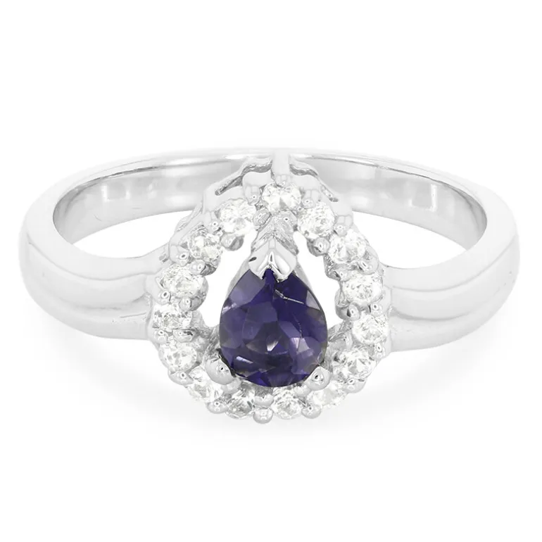 Entdecken Sie die bezaubernde Schönheit dieses Rings aus Sterlingsilber, gekrönt von einem faszinierenden Ceylon-Iolithen von 0,24 Karat im Birnenschliff, umrahmt von einer Reihe funkelnder weißer Topase von insgesamt 0,261 Karat. Das elegante, präzise gefertigte Design verfügt über ein Band aus 925er Sterlingsilber, das die strahlenden Indigotöne des Iolithen hervorhebt. Dieser Ring eignet sich perfekt für Abendveranstaltungen oder als schicke Ergänzung zu Ihrer Bürokleidung und verleiht jedem Ensemble einen Hauch von Luxus und Raffinesse.