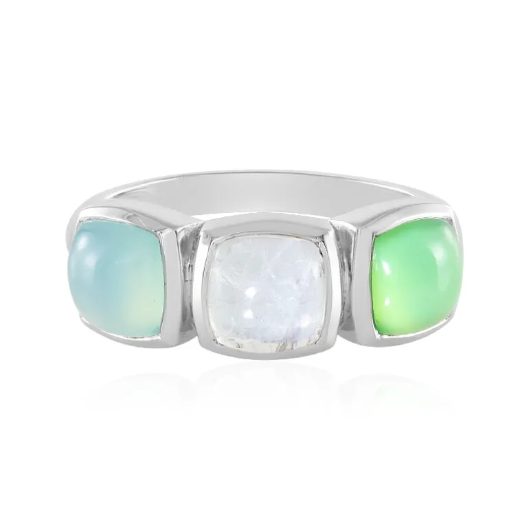 Entdecken Sie die Faszination unseres Tri-Gemstone Rings mit einem Trio von Edelsteinen im Kissen-Cabochon-Schliff von insgesamt 3 ct. Das Herzstück ist ein ruhiger blauer Mondstein, flankiert von den subtilen Farbtönen des Aqua-Chalcedons und des lebhaften grünen Chalcedons, wobei jeder Edelstein seinen eigenen Charme hat. Dieser 22×19 mm große Ring ist aus hochglänzendem 925er Sterlingsilber gefertigt und fasst 6 mm große Edelsteine in einem antik inspirierten Design. Dieses Schmuckstück eignet sich perfekt, um einen Farbtupfer in Ihr Ensemble zu bringen, und ist ideal für den eleganten Alltag oder als Gesprächsanlass bei besonderen Anlässen.