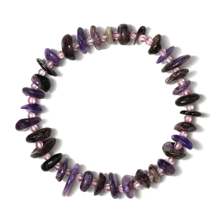 Entdecken Sie die bezaubernden Farben Russlands mit diesem prächtigen Armband, das eine luxuriöse Mischung aus tiefviolettem Charoite und zartrosa Quarzperlen zeigt. Mit einer komfortablen Länge von 18 cm und einem Gesamtgewicht von 69,854 Karat verspricht dieses Armband ein elegantes Statement an Ihrem Handgelenk. Dieses Armband ist ideal, um einen Hauch von Farbe in ein legeres Ensemble zu bringen oder ein Abendoutfit zu ergänzen. Genießen Sie die reiche, edelsteinbesetzte Pracht, die Ihr Handgelenk bei jeder Bewegung anmutig umkreist.