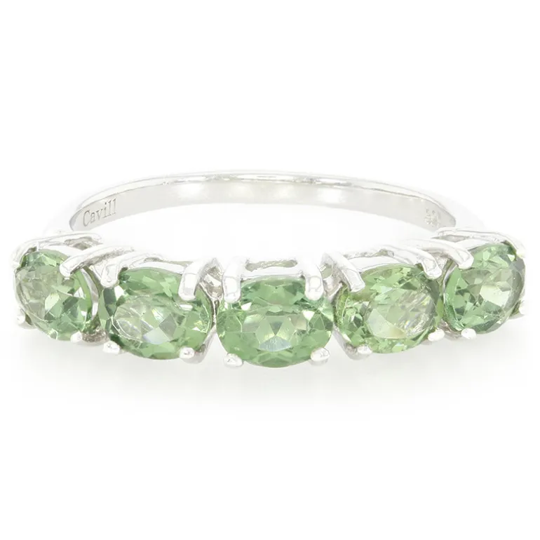 Entdecken Sie die Anziehungskraft dieses raffinierten Silberrings, der fünf exquisite Russische Chrom-Apatite von insgesamt 1,52 Karat präsentiert. Jeder Edelstein ist im Ovalschliff geschliffen, um seinen faszinierenden grünen Farbton zu betonen. Er ist sorgfältig in platiniertes 925er Sterlingsilber gefasst, was ihm einen zusätzlichen Hauch von Luxus verleiht. Mit seinem eleganten Design eignet sich dieser Ring sowohl für den Alltag als auch für besondere Anlässe. Kombinieren Sie ihn mit einem klassischen Ensemble oder einem schicken Cocktailkleid, um Farbe und Stil zu zeigen.