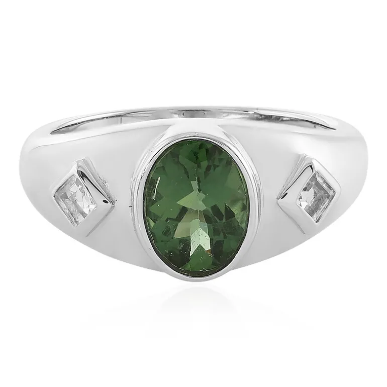 Tauchen Sie ein in das üppige grüne Geheimnis dieses Rings aus brasilianischem Chrom-Apatit, flankiert vom Funkeln zweier weißer Topase. Dieses elegante Schmuckstück aus 925er Sterlingsilber präsentiert einen zentralen Edelstein im Ovalschliff von 1,058 Karat, der in ein modernes Design gefasst ist. Mit einem Gesamtkaratgewicht von 1,269 ct und einem modernen Silberfinish ist es eine vielseitige Ergänzung für jede Schmucksammlung. Der 8×6 mm große Apatit strahlt Raffinesse aus und eignet sich sowohl für die Eleganz des Alltags als auch für den Glamour des besonderen Anlasses.