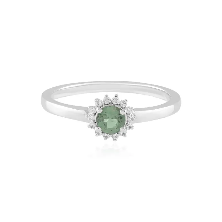 Führen Sie Ihre Hand in die funkelnde Schönheit unseres brasilianischen Chrom-Apatit-Sterlingsilberrings, gekrönt von einem 0,231 Karat großen Edelstein im Rundschliff. Verziert mit dem Funkeln von 14 kambodschanischen Zirkonen im Rundschliff von insgesamt 0,088 Karat, ist dieser Ring ein Zeugnis eleganter Schlichtheit. Geschmiedet aus 925er Sterlingsilber und mit einem Gewicht von ca. 1,39 g ist er mit seinem sanften Grünton und seiner floralen Silhouette die ideale Wahl für den Alltag oder besondere Anlässe. Perfekt für ein subtiles Statement zu einem legeren Outfit oder als raffinierter Akzent zur Abendgarderobe.