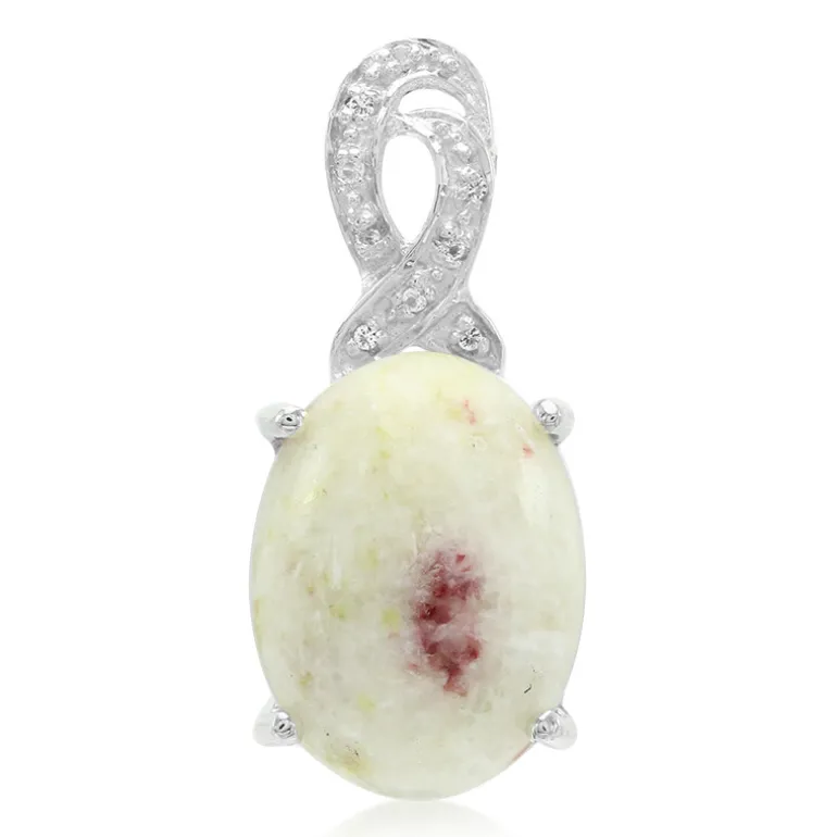 Entdecken Sie die Faszination dieses einzigartigen Anhängers mit einem fesselnden ovalen Cinnabar-Cabochon von 8,35 Karat, eingebettet in 925er Sterlingsilber. Die Seltenheit dieses aus den USA stammenden Edelsteins wird durch das Funkeln von neun brasilianischen weißen Topasen verstärkt, die zusammen zu einem Gesamtkaratgewicht von 8,386ct beitragen. Mit seinen Maßen von 27 x 12 mm ist dieser Anhänger ein Statement, das sowohl zu Tages- als auch zu Abendkleidung passt und perfekt für alle ist, die den Zauber natürlicher Edelsteine zu schätzen wissen.