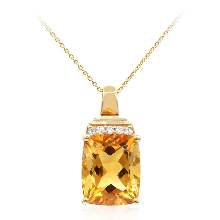 Entdecken Sie den Glanz unseres brasilianischen Citrin-Anhängers, der kunstvoll aus glänzendem 14 Karat Gelbgold gefertigt ist. Die Hauptattraktion ist ein 4,233 Karat schwerer Citrin, der einen satten goldenen Farbton und einen majestätischen Antikschliff aufweist und etwa 11 x 9 mm groß ist. Dieses elegante Schmuckstück wird durch das Funkeln von fünf Diamanten im Brillantschliff mit einer Reinheit von SI2 und einem Gesamtgewicht von 0,05 Karat akzentuiert. Der Anhänger hängt elegant an einer zarten Kette, die von 40,5 bis 45,5 cm verstellbar ist und sich an jedes Dekolleté anpassen lässt. Er ist eine raffinierte Wahl für das Tragen von Tag zu Abend und verleiht jedem Ensemble einen warmen, einladenden Glanz.