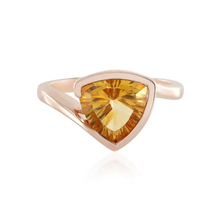 Dieses atemberaubende Schmuckstück zeigt einen strahlenden brasilianischen Citrin mit einem Gewicht von 2,826 Karat, der fachmännisch in eine konkave Trillion-Form geschliffen wurde, die das Licht einfängt und die Tiefe seines warmen Farbtons offenbart. Der Ring ist in zartes, rosévergoldetes 925er Sterling Silber gefasst und bietet einen modernen Twist auf klassische Eleganz. Die Größe des Edelsteins von 10 mm macht ihn zu einem auffälligen Schmuckstück, das sich sowohl für Abendveranstaltungen als auch für den täglichen Luxus eignet. Kombinieren Sie ihn mit neutralen Tönen, um diesen fröhlichen Ring erstrahlen zu lassen.