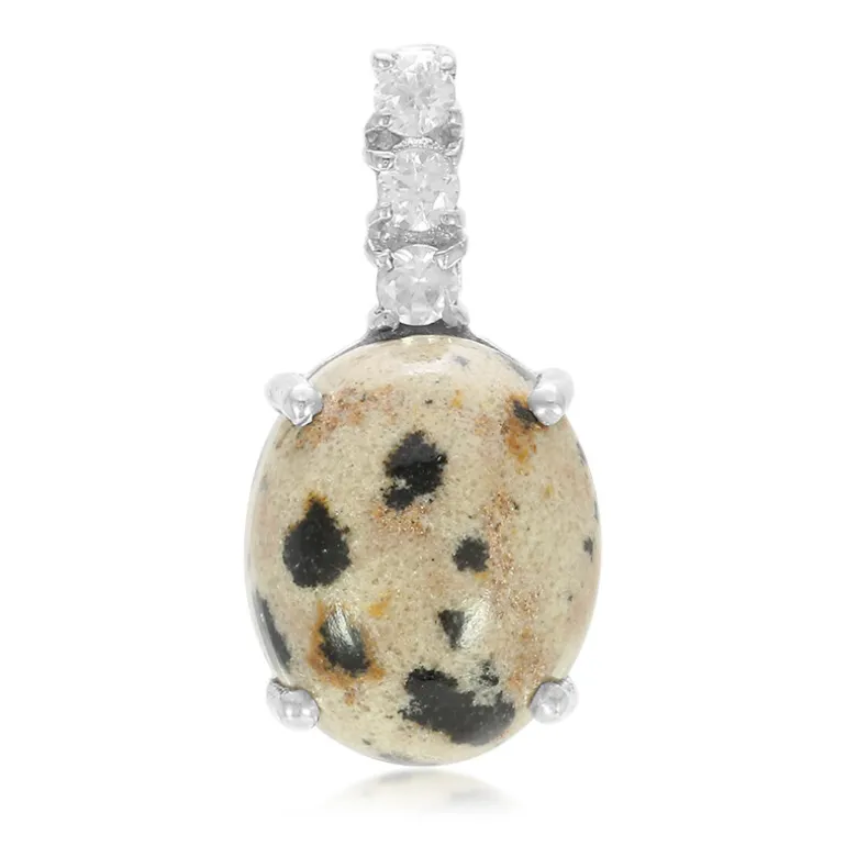 Entdecken Sie die Eleganz dieses Anhängers aus dalmatinischem Jaspis, der aus 925er Sterlingsilber gefertigt ist. Der ovale Cabochon von 3,5 Karat aus den USA setzt funkelnde Zirkon-Akzente aus Kambodscha. Dieses Schmuckstück eignet sich sowohl für legere als auch für formelle Anlässe und verleiht jedem Outfit einen Hauch von Raffinesse. Kombinieren Sie ihn mit einer Silberkette für einen eleganten Alltagslook oder tragen Sie ihn zu einem schwarzen Abendkleid.