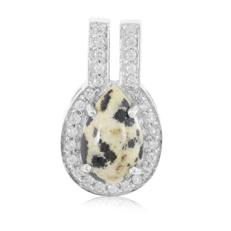 Dieser ebenso unverwechselbare wie elegante Anhänger besteht aus einem tropfenförmigen Dalmatiner-Jaspis von 3,88 Karat, der aus den Vereinigten Staaten stammt und inmitten von 29 funkelnden kambodschanischen Zirkonsteinen von insgesamt 0,685 Karat eingefasst ist. Der 25 x 14,5 mm große Anhänger ist aus hochwertigem 925er Sterlingsilber gefertigt, wiegt ca. 2,66 g und ist mit seinem einzigartigen gesprenkelten Muster vielseitig einsetzbar. Er eignet sich perfekt, um einem raffinierten Ensemble einen Hauch von Verspieltheit zu verleihen oder ein Freizeitoutfit aufzuwerten, und sorgt bei jeder Gelegenheit für Gesprächsstoff.